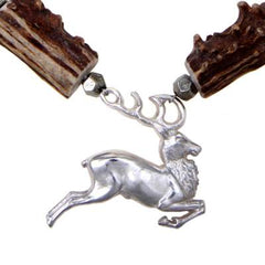 Das Collier besteht aus Rehhornelementen, die mit Pyritkugeln aufgereiht sind. Mittelpunkt bildet ein springender Hirsch.