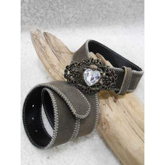 Ein hochwertiger Ledergürtel aus weichem Hirschleder in elegantem Taupe. Die auffällige Barock-Schnalle mit einem funkelnden weissen Herzstein verleiht dem Gürtel einen edlen und romantischen Look.