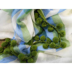 Elegant und vielseitig – diese exklusive handgefertigte Stola kann sowohl als leichter Sommerschal als auch als stilvolles Accessoire getragen werden. Die zarten Naturtöne mit Streifen in Blau und Grün verleihen ihr eine frische und edle Ausstrahlung. Abgerundet wird das Design durch grüne Pommel-Verzierungen, die der Stola eine besondere Note verleihen.