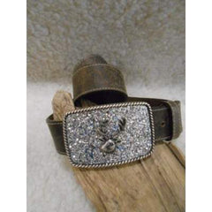 Ein edler Ledergürtel aus hochwertigem braunem Leder mit rustikalem Charme. Die rechteckige Schnalle ist aufwendig mit funkelnden Swarovski-Steinen besetzt und zeigt ein kunstvoll gestaltetes Hirschkopf-Motiv.