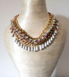 Ein auffälliges Statement-Piece mit luxuriösem Design. Die goldfarbene Kette ist aufwendig mit funkelnden Steinen und kunstvoll geflochtenen Details verziert. Weisse Tropfenanhänger verleihen ihr eine elegante, extravagante Note. Perfekt für besondere Anlässe oder als stilvolles Accessoire, das jedes Outfit aufwertet.