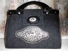 Elegante Tasche mit Lodenstoff und Stickerei. Schulterriemen und Tragegriffe aus Leder.